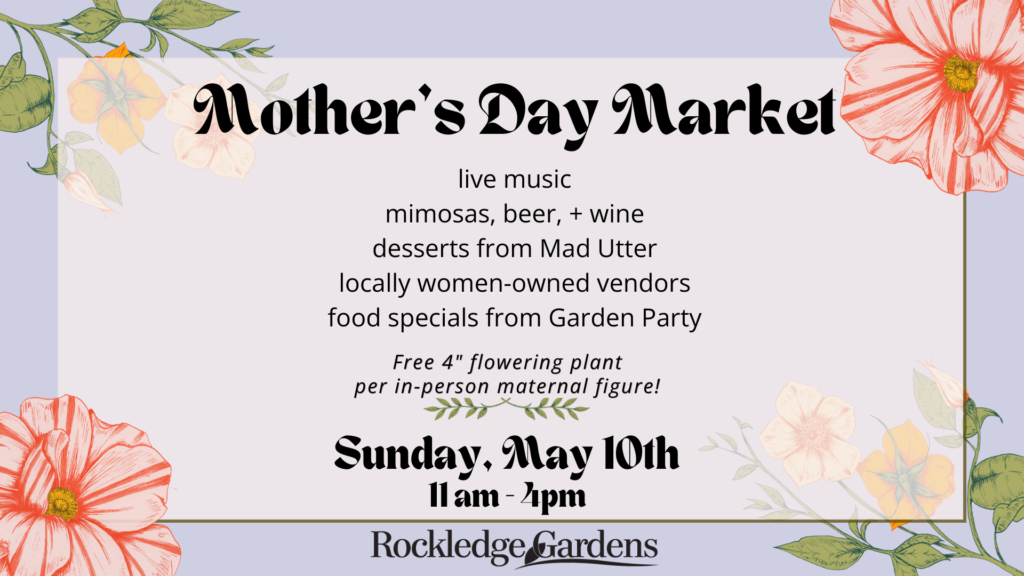 Join us with your family on Sunday, May 10th from 11am to 4pm for our annual Mother’s Day Market! Find local makers + artisans to shop for the perfect Mother’s Day gift, plus one free 4-inch flowering plant from Rockledge Gardens for every maternal figure! Must be redeemed in-person.